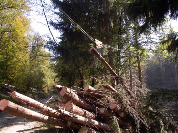 Kurzstreckenseilkran mit Retourline für bergauf- und bergab Bringung, 200 m Tragseillänge, Zugleistung 1,6 to, aufgebaut auf Knickschlepper Kockums 822. Geeignet für mittleres Holz bis ca. 1 FM, da geländegängig universell einsetzbar, schnell aufgebaut. Diese Maschine ist auch besonders gut geeignet zum Vorliefern in der Ebene z. B. bei nicht tragfähigen Böden oder weiten Rücke- gassenabständen. Dieses Verfahren ist sehr pfleglich, da der Stammfuß beim Ziehen angehoben wird.