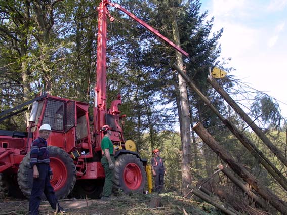 Kurzstreckenseilkran mit Retourline für bergauf- und bergab Bringung, 200 m Tragseillänge, Zugleistung 1,6 to, aufgebaut auf Knickschlepper Kockums 822. Geeignet für mittleres Holz bis ca. 1 FM, da geländegängig universell einsetzbar, schnell aufgebaut. Diese Maschine ist auch besonders gut geeignet zum Vorliefern in der Ebene z. B. bei nicht tragfähigen Böden oder weiten Rücke- gassenabständen. Dieses Verfahren ist sehr pfleglich, da der Stammfuß beim Ziehen angehoben wird.